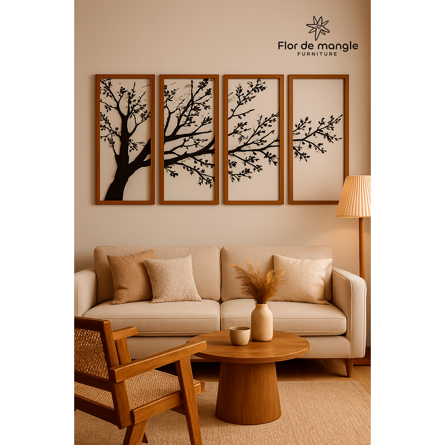 Este conjunto de cuatro paneles decorativos captura la belleza sutil de un árbol en expansión, convirtiéndose en el centro visual de cualquier espacio. Su diseño en silueta negra sobre fondo neutro crea un impacto visual elegante y moderno, perfecto para salas, recibidores u oficinas.