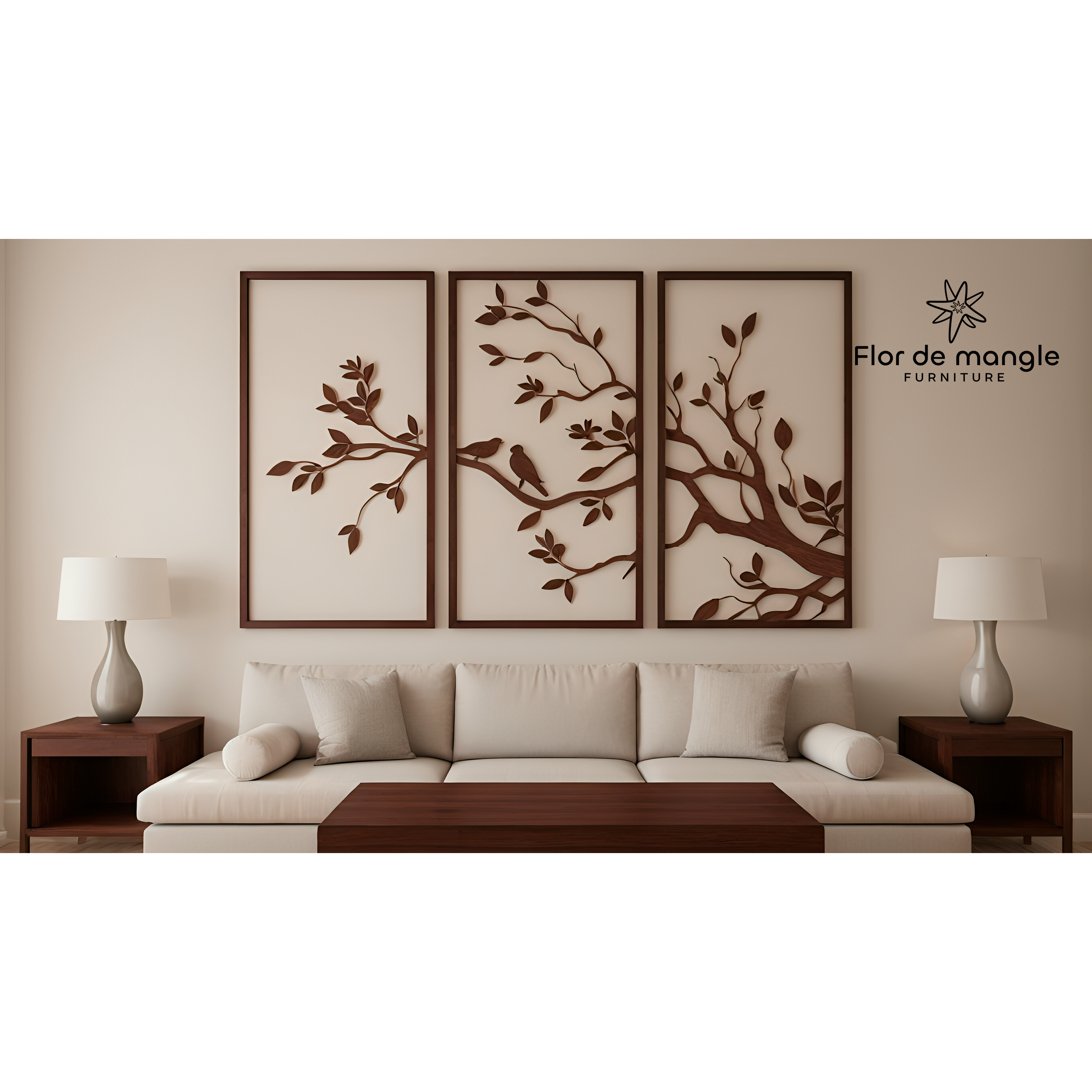 Esta pieza mural tridíptica evoca la paz de un nuevo día: ramas extendidas con hojas sutiles y aves posadas armoniosamente, transmiten una sensación de calma y libertad. El diseño se divide en tres paneles perfectamente equilibrados que, en conjunto, forman una obra natural y sofisticada. Ideal para enmarcar salas, recibidores u oficinas con un toque orgánico y elegante.