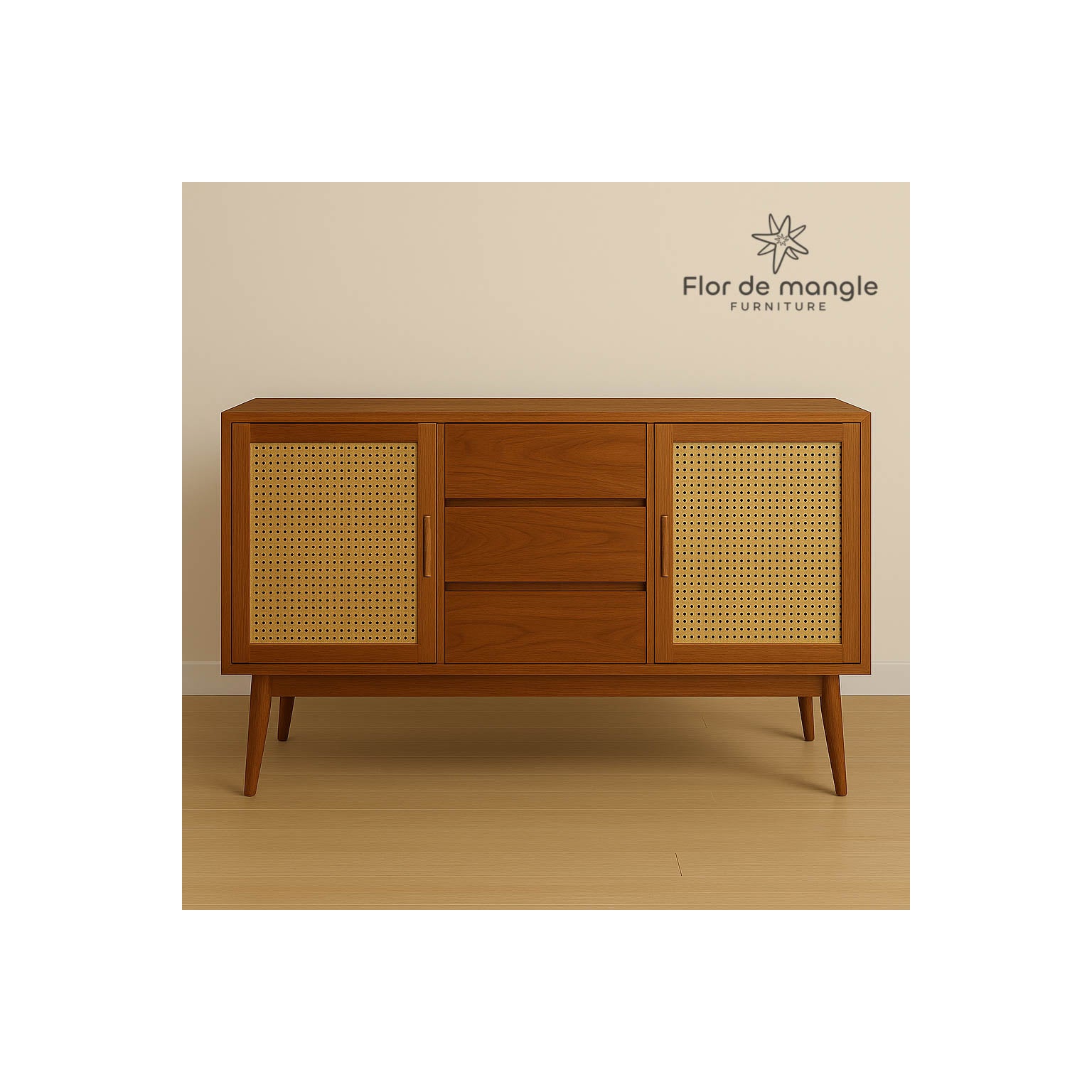 Las tres gavetas centrales, de cierre suave, brindan un almacenamiento generoso y ordenado. La estructura se eleva con patas estilo escandinavo, proporcionando estabilidad y un perfil liviano visualmente. Disponible en diferentes tonalidades para adaptarse a distintos estilos de decoración.