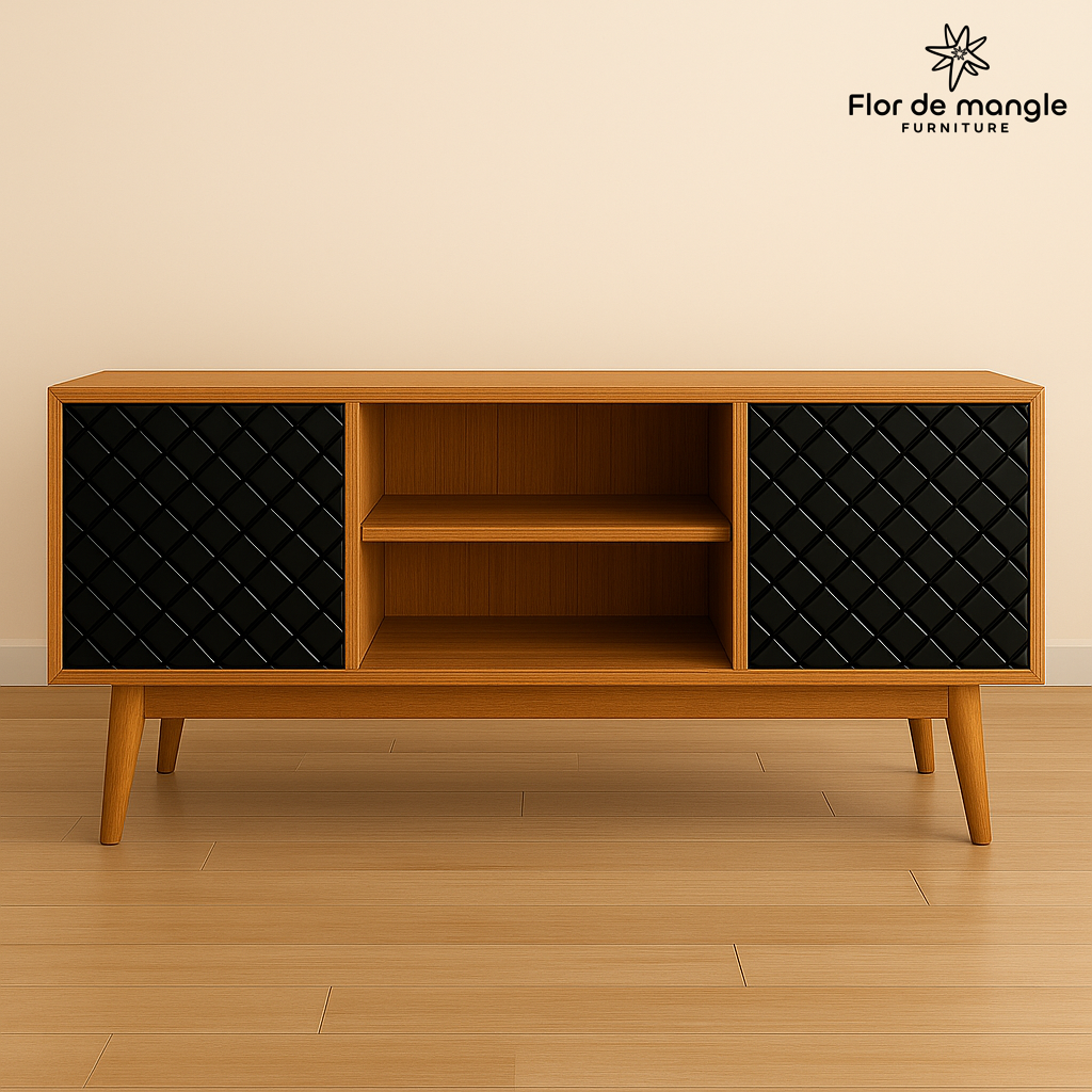 Sus puertas corredizas en negro con patrón acanalado tipo diamante realizados con tecnologia CNC brindan un contraste elegante, ocultando espacios de almacenamiento ideales para objetos personales, vajillas o equipos electrónicos. El área central abierta con dos repisas es perfecta para libros, decoraciones o dispositivos de uso diario.