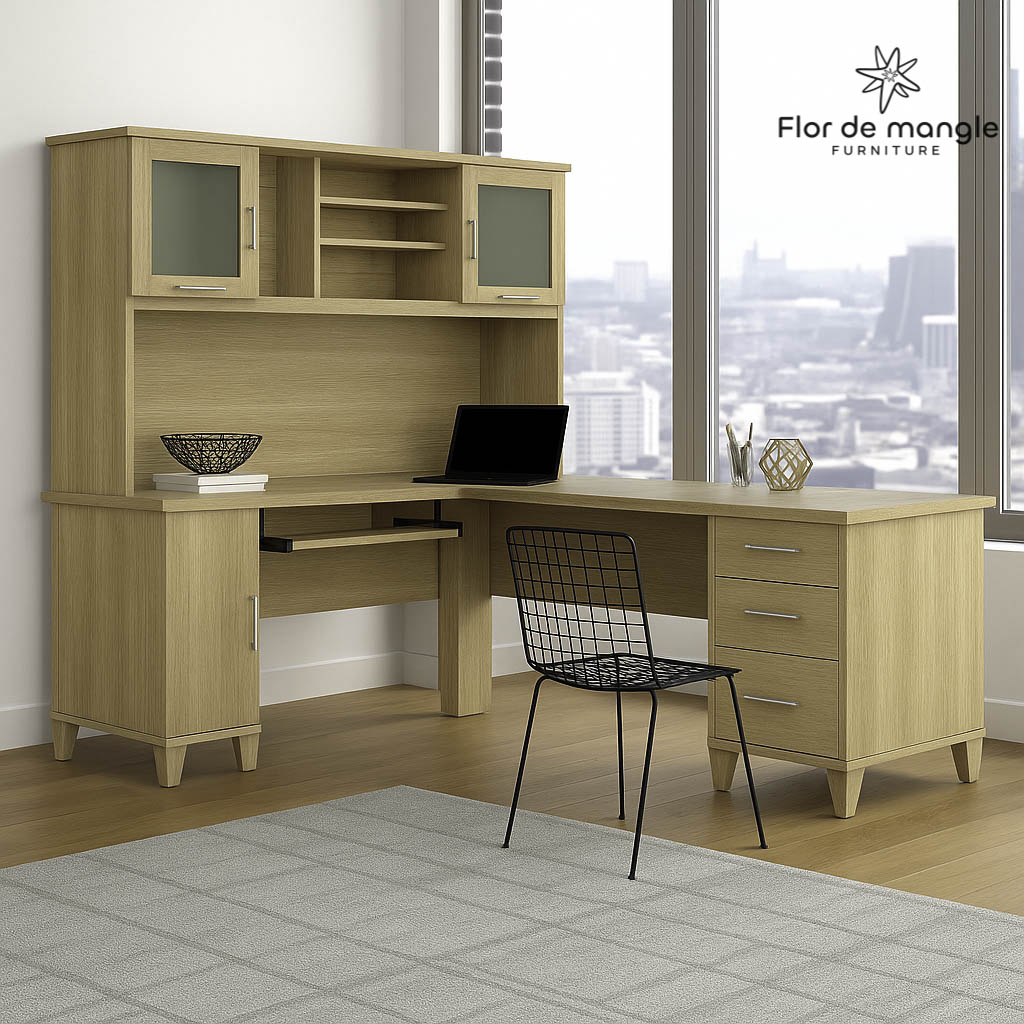 El escritorio “Home Office Plus” de Flor de Mangle está diseñado para quienes necesitan funcionalidad total en casa o en la oficina. Su diseño en L incluye una cajonera de tres niveles, bandeja deslizable para teclado, módulos superiores con puertas de vidrio esmerilado y compartimentos organizadores para documentos, papelería y objetos decorativos. Fabricado en madera industrializada de alta calidad, este modelo maximiza el espacio vertical y horizontal, combinando practicidad y estilo.
