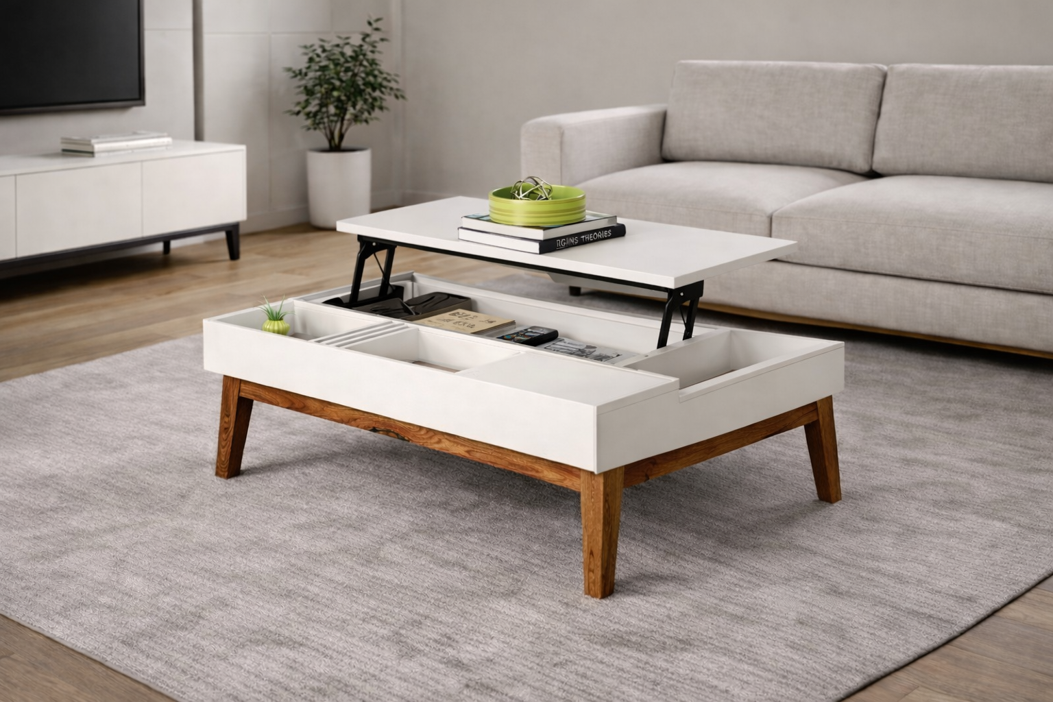 Su cubierta abatible integra un sistema oculto de elevación que revela un amplio compartimento de almacenamiento interior, ideal para organizar libros, controles, dispositivos o accesorios del día a día, manteniendo la sala visualmente ordenada.