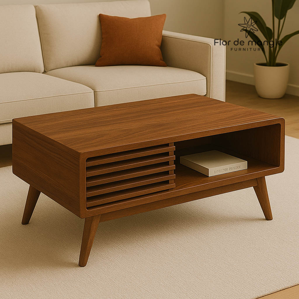 La mesa de centro “Scandi Louver” de Flor de Mangle combina el encanto del diseño escandinavo con detalles modernos, gracias a su módulo con listones decorativos tipo louver. Este diseño no solo aporta carácter y textura, sino que también ayuda a mantener tus objetos organizados y ocultos, mientras que el compartimento abierto es perfecto para libros o accesorios decorativos.