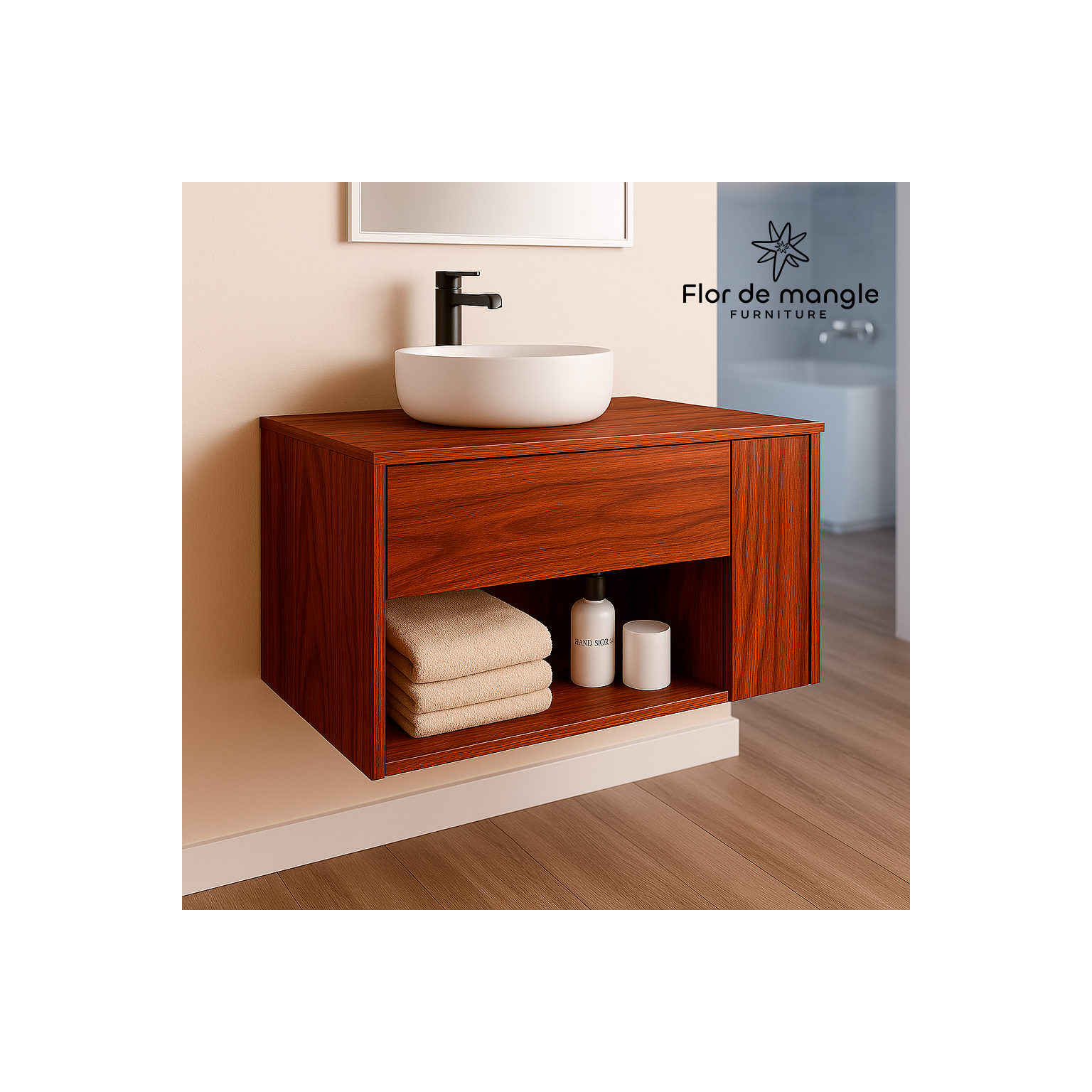 Este producto incluye únicamente el mueble de madera fabricado enchapado. Los lavabos, grifería, espejos, accesorios decorativos y demás elementos mostrados en las imágenes son de carácter ilustrativo y no están incluidos en la compra.
