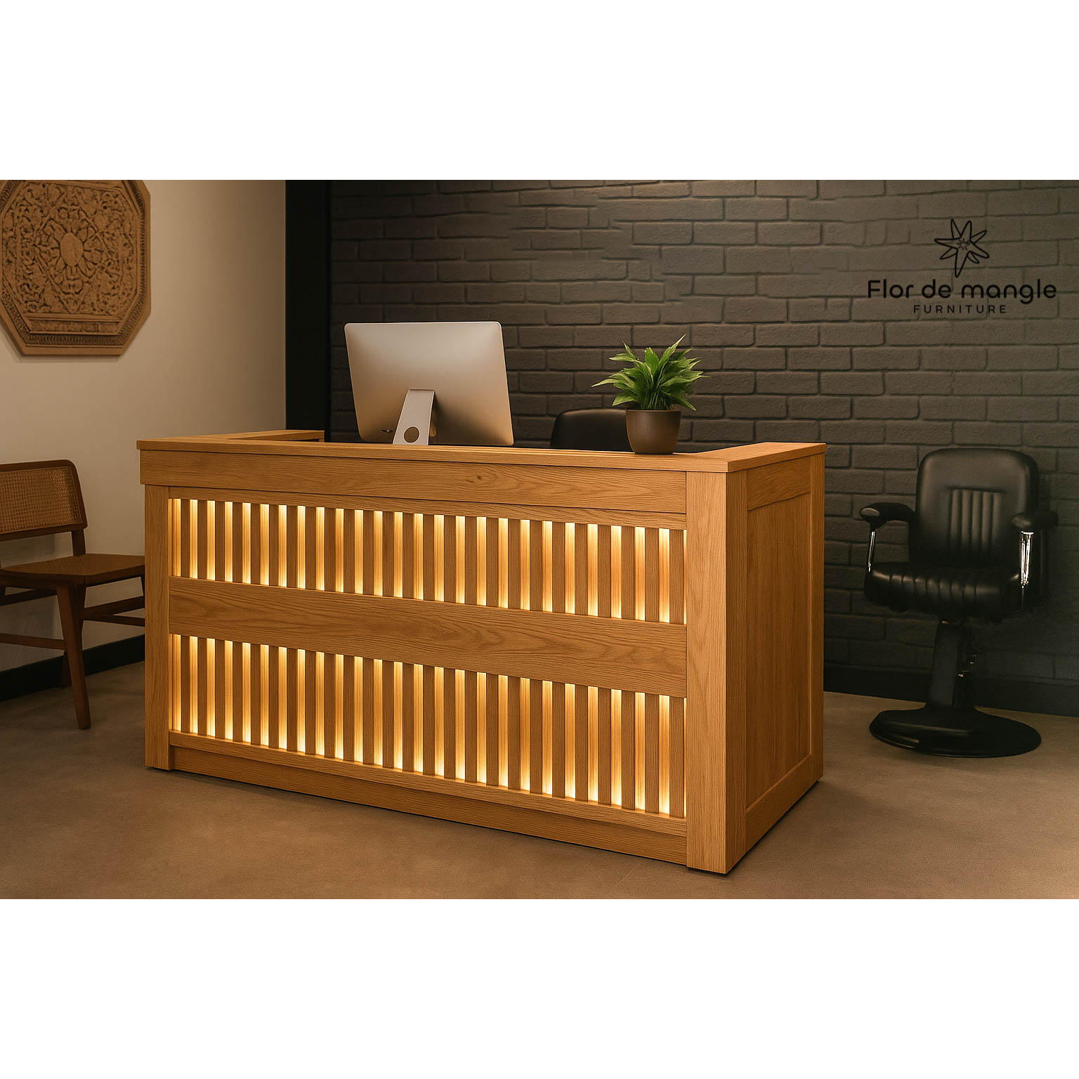 La recepción “Warm Lines” de Flor de Mangle destaca por su diseño acogedor con listones verticales iluminados que generan un...