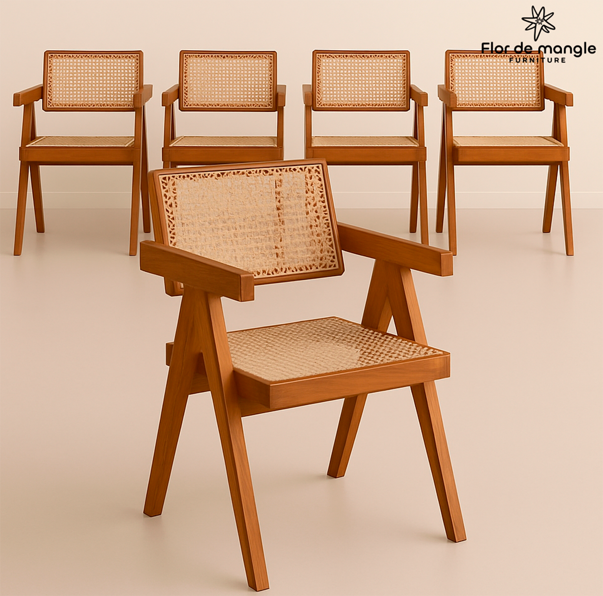 La silla Nicté I es una reinterpretación contemporánea de la clásica silla de rejilla. Su estructura en madera sólida, acompañada de asiento y respaldo en tejido de enea o ratán natural, ofrece frescura, ligereza visual y comodidad. Su silueta geométrica y brazos angulados la hacen ideal para comedores, terrazas techadas o espacios con acento tropical y cálido.